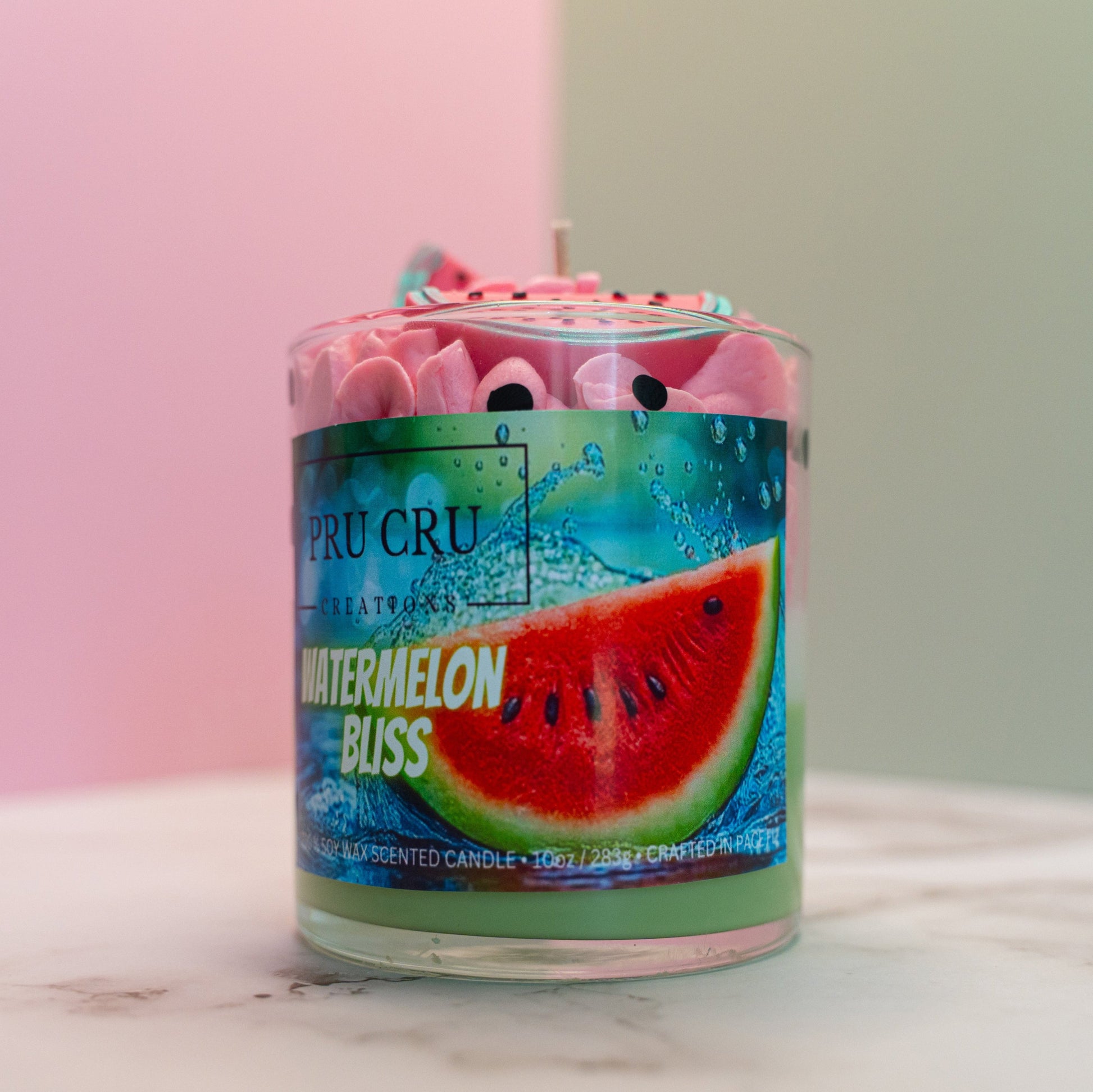 Close your eyes and take a bite out of summer—Watermelon Bliss captures the carefree joy of sunshine-soaked afternoons and sweet, sticky smiles. This dessert-inspired candle layers the juicy brightness of ripe watermelon with a hint of honeydew for a mouthwatering opening. A heart of sun-drenched melon melts seamlessly into sugared bliss, bringing warmth and nostalgia to every flicker.